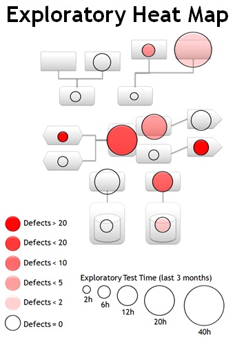 Cirklarnas storlek representerar hur mycket exploratory test tid som delen blivit utsatt för och färgen antalet just nu öppna rapporterade buggar.