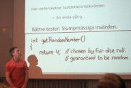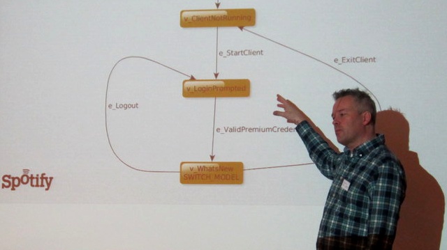 Kristian Karl (testchef Spotify) höll i konferensens andra seminarie under vilket han berättade om hur Spotify arbetade med kvalitet. Eller nja… Det blev mest en beskrivning av Model-Based Testing. Mycket bra introduktion till MBT dock! Vidare hann Kristian diskutera testautomatiserare kontra testutvecklare, gorillan i rummet, m.m. Detta blev kanske inte den bästa summeringen av passet men det var mycket inspirerande och ryktet säger att Kristian fick demo MBT i baren långt in på kvällen.