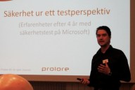 Första passet hölls av Viktor Laszlo (Prolore). Han berättade om sin erfarenhet av säkerhetstestning från 4 år på Microsoft. Det kom att mest handla om Microsoft Security Development Lifecycle och STRIDE. Buskapet var att om man tar hänsyn till STRIDE (Spoofing, Tempering, Repudiation, Information Disclosure, Denial of Service och Elevation of Privilige) i sin hotbild behöver man inte förstå de individuella hoten, man har ett gott och tryggt säkerhetsskydd ändå. Det var mycket intressant, konkret och väckte nog mångas intresse och nyfikenhet kring säkerhetstestning.