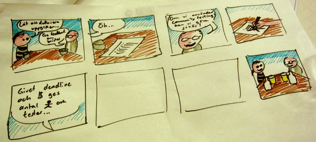 Hade man tvivlat på att fokuset för TestZonen 2012 var just diskussion och nätverkande var alla tvivel som bortblåsta vid det här laget. Nästa övning bestod i att vi skulle planera upp testning kring Dropbox som kallat in oss (dvs. The Super Test Squad). Vi delades återigen upp i grupper om vardera fem personer. Jag och Martin Karsberg fann dock att vi var de enda två i vår grupp. Det började bra med en vårt eget förtydligande av uppdraget. Men eftersom vi bara var två kunde vi inte riktigt luta oss tillbaka på gruppens kollektiva intelligens (eller ansvarstagande). Resultatet blev trots det en fin färglagd serie (och varsin öl som belöning).
