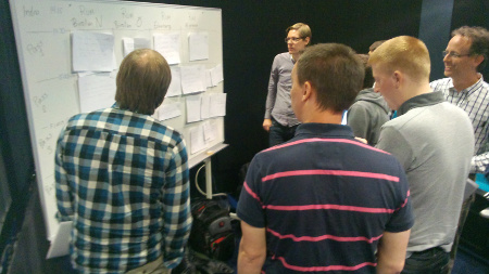 Efter morgonfikat och tjenare-hej-snacket gick vi laget runt och presenterade vilket projekt var och en tänkt ägna sig åt. Kl 17 är det dags för första demon. När genomgången var över och agendan för dagen satt fylldes strax rummet av tystnad och tangentbordssmatter.