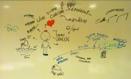 För att lära kännan varandra körde vi en övning där vi parade ihop oss och intervjuade varandra. Svaren dokumenterades såklart i en illustration. Detta är Tobias Fors summering av mig 🙂
