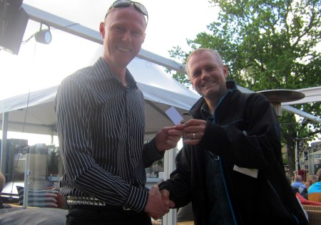 Jag tar emot nyckeln till kontoret från Mats Henricsson (vd på Crisp).