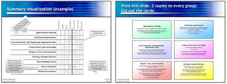 Denna övning är perfekt att köra i teamet som kommer jobba tillsammans under lång tid eller på avdelningen där man vill höja medvetenheten kring vad det betyder att jobba agilt. Deltagarna delas upp i grupper om två-tre personer. Varje grupp delges två kortlekar bestående av nio kort. Varje kort representerar en agil värdering.
