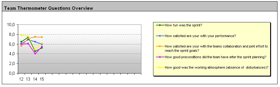 ”Team Thermometer” är ett verktyg för det agila team för att utvärdera dess “hälsa” just nu, hur det gick under förra sprinten och hur stämningen i teamet är. Övningen användas lämpligen under Sprint Retrospective, antingen som en uppvärmare (för att ställa om till rätt mindset) eller som bas för en djupare och bredare diskussion.